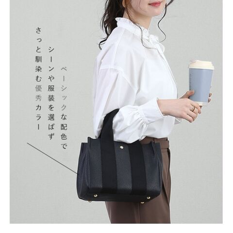 本革のようなシボ加工を施したバッグ生地にコットンテープハンドルを組み合わせた、カジュアルになりすぎないデザインがおしゃれ!