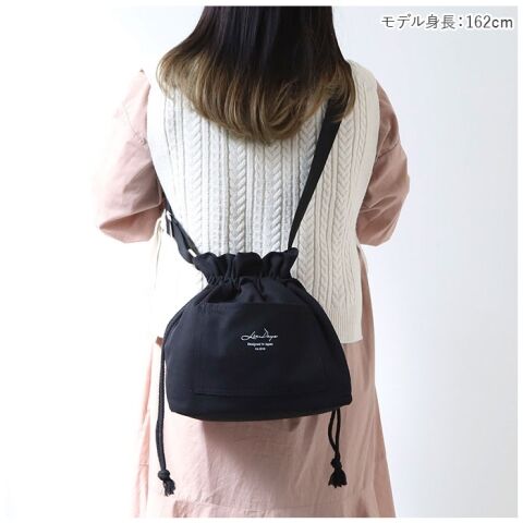 巾着紐を絞らずスタンダードなショルダーバッグとして、巾着紐を絞って肩掛けや斜め掛けもOK! ショルダーベルトは長さ調節が可能。