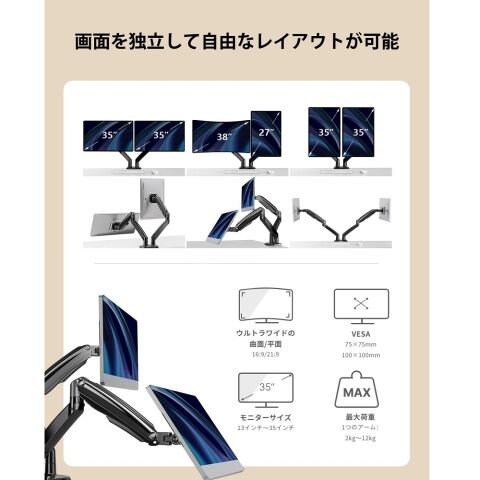 13インチから35インチまで、幅広いサイズのモニターに対応可能なシングルアームのモニターアームです。