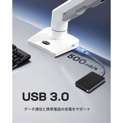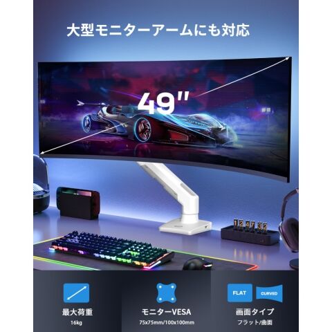 このモニターアームは、27インチから49インチまでの超ワイドスクリーンモニターに対応し、特にゲーミングユーザーに最適です。