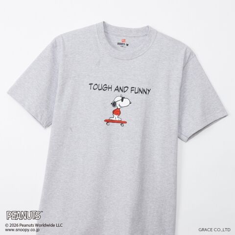 ◆BEEFY(R)のコンセプト「タフであること」が込められた「TOUGH AND FUNNY」の印象的なメッセージと、元気よくスケートボードを乗りこなすスヌーピーの変装姿のひとつ、クールな大学生に扮したJOE COOL(ジョー・クール)を胸元にデザイン。