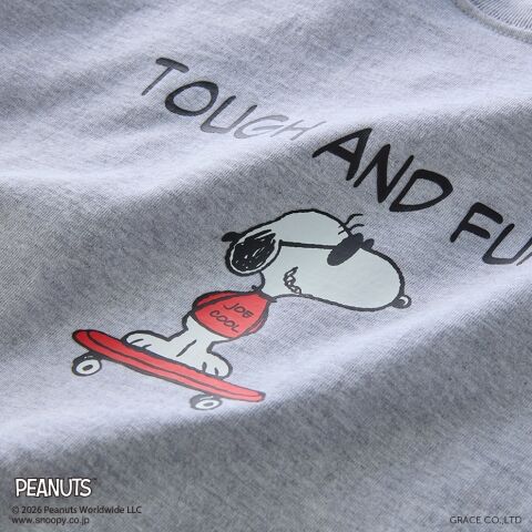 ◆BEEFY(R)のコンセプト「タフであること」が込められた「TOUGH AND FUNNY」の印象的なメッセージと、元気よくスケートボードを乗りこなすスヌーピーの変装姿のひとつ、クールな大学生に扮したJOE COOL(ジョー・クール)を胸元にデザイン。
