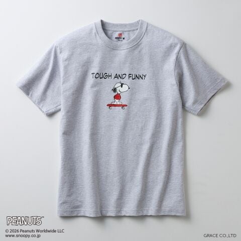 ◆BEEFY(R)のコンセプト「タフであること」が込められた「TOUGH AND FUNNY」の印象的なメッセージと、元気よくスケートボードを乗りこなすスヌーピーの変装姿のひとつ、クールな大学生に扮したJOE COOL(ジョー・クール)を胸元にデザイン。