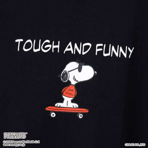 ◆BEEFY(R)のコンセプト「タフであること」が込められた「TOUGH AND FUNNY」の印象的なメッセージと、元気よくスケートボードを乗りこなすスヌーピーの変装姿のひとつ、クールな大学生に扮したJOE COOL(ジョー・クール)を胸元にデザイン。