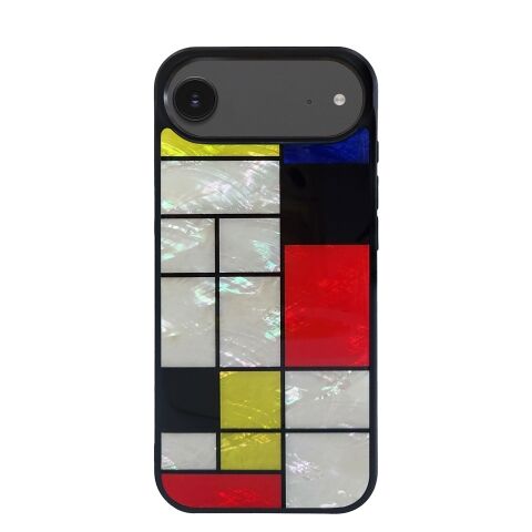 モンドリアンの絵画のような幾何学パターンとビビッドカラーが印象的な天然貝ケースです。