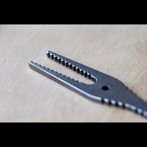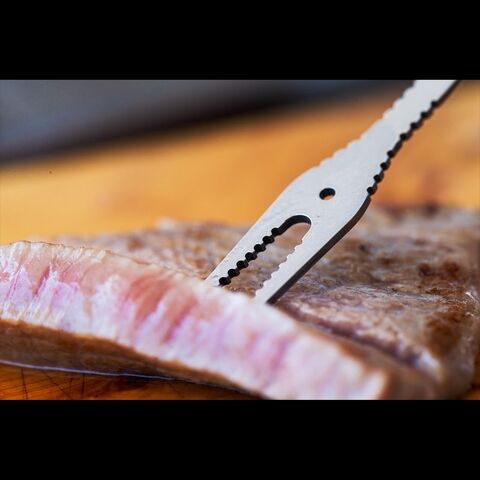 オプション品のピックフォーク『指叉』の内部はギザギザになっておりますので刺した食材が落ちにくく、また持ち手側も少々鋭利なので持ち替えて頂くと串としてもご使用頂けます。