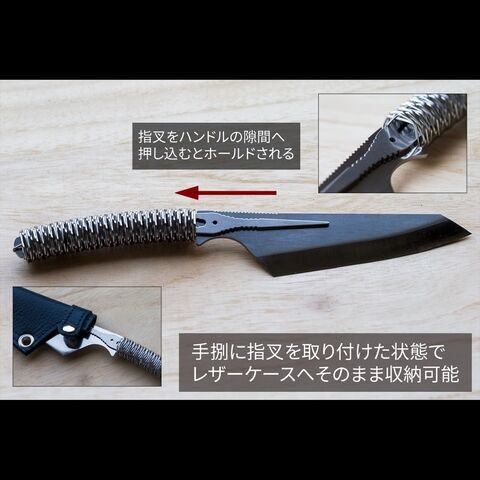 手捌と掌のシースへナイフと一緒に収納することができるので食材を切る際の抑えとしてもお役立て頂けます。
