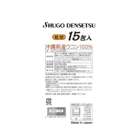 ■原料:"春ウコン(沖縄県産)、沖縄皇金(ウコン成分の36%)、食物繊維(イヌリン)、難消化性デキストリン、乳糖(乳成分を含む)、グァバ、ギムネマ・シルベスタ、紫ウコン、白ウコン、マンジェリコン、ジュリコン/セルロース、ショ糖脂肪酸エステル、シェラック"