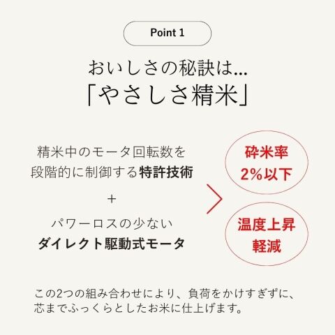 精米時の摩擦と温度上昇を抑え、お米の割れを防ぎながら、粒立ちの良いふっくらごはんに仕上げます。