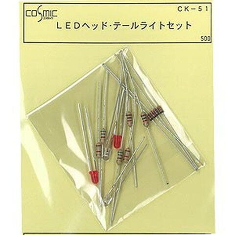 抵抗・ダイオードも組み合わせ式なので自由自在に回路組がOK。 抵抗値を変えれば、明るさも変わります。 ヘッドライト用は白色、テールライト用は赤色です。