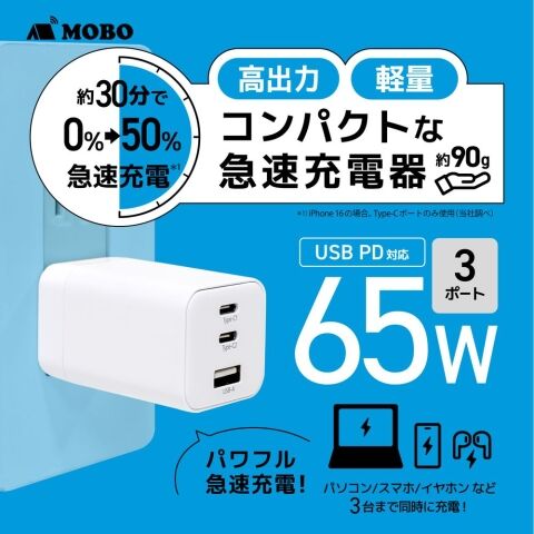 MOBO(モボ) 折りたたみ式プラグ搭載 コンパクトAC充電器 65W Type-A 1ポート/Type-C 2ポート(ホワイト) AM-PDMGAN65W-WH 【返品種別A】