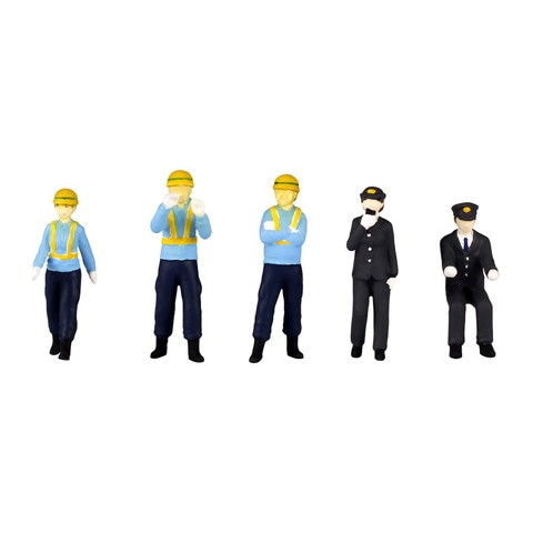「エキスパートな鉄道員セット」は男性運転手・女性車掌・歩行女性整備士・腕組み確認中男性整備士・点検中男性整備士の5体で、制服や作業服もしっかり造形しています。