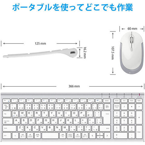 キーボードとマウスは一つのUSBレシーバーを共用し、USBレシーバーをデバイスに差し込むだけで使用できます。
