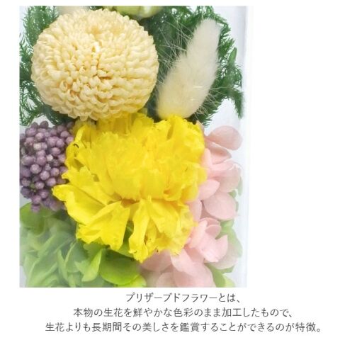◆プリザーブドフラワーとは、本物の生花を鮮やかな色彩のまま加工したもので、生花よりも長期間その美しさを鑑賞することができるのが特徴。