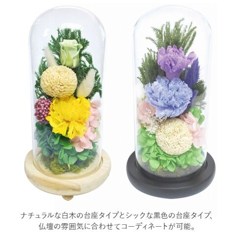 ◆大切な方を偲んで、いつまでも綺麗なお花を捧げたい・・・。色彩豊かなプリザーブドフラワーをガラス容器に閉じ込めた「お供え ガラスドーム」
