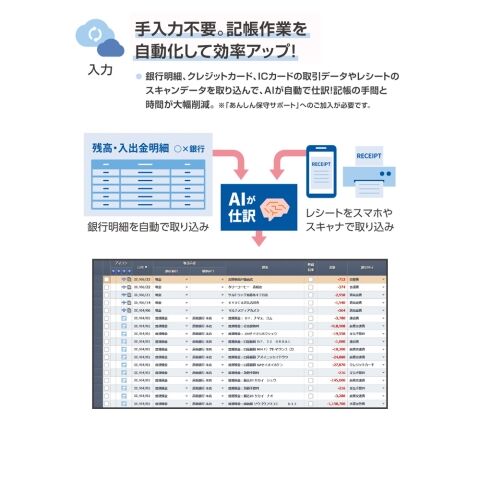 ・銀行明細の自動取込、レシートのスキャン取込で自動で仕訳ができる(あんしん保守サービス加入必須)