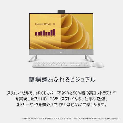 第13世代 インテル Core i プロセッサー搭載のモダンなデザインの27インチ オールインワン。スリム ベゼルで、sRGBカバー率99%と1500:1の高コントラストを実現したフルHD IPSディスプレイなら、仕事や勉強、ストリーミングを鮮やかでリアルな色彩にて楽しめます。また、有害なブルーライトの発生を抑制する設計のDell ComfortView Plusにより、長時間の作業でも目の疲労を軽減できます。