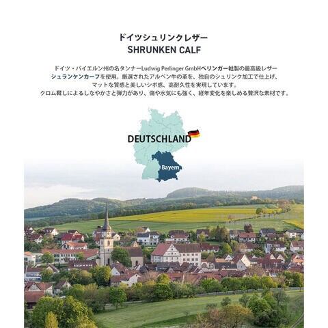 ドイツ・バイエルン州の名タンナーLudwig Perlinger GmbHペリンガー社製の最高級レザーシュランケンカーフを使用。厳選されたアルペン牛の革を、独自のシュリンク加工で仕上げ、 マットな質感と美しいシボ感、高耐久性を実現しています。クロム鞣しによるしなやかさと弾力があり、傷や水気にも強く、経年変化を楽しめる贅沢な素材です。