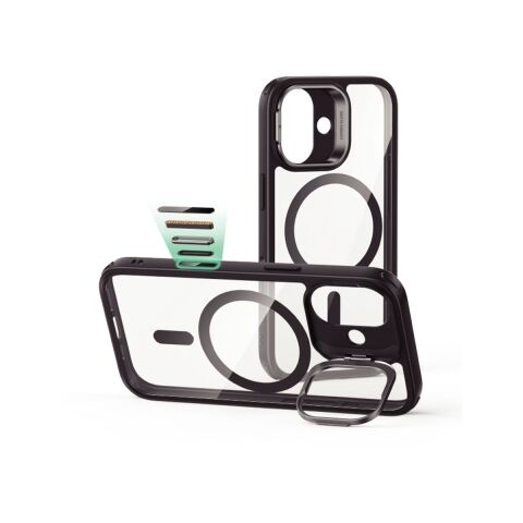 カメラフレームが隠しスタンドとして展開するハイブリッドクリアケースです。MagSafe対応アクセサリがスムーズに吸着する、強力なマグネットを搭載しています。
