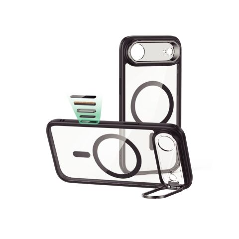 カメラフレームが隠しスタンドとして展開するハイブリッドクリアケースです。MagSafe対応アクセサリがスムーズに吸着する、強力なマグネットを搭載しています。