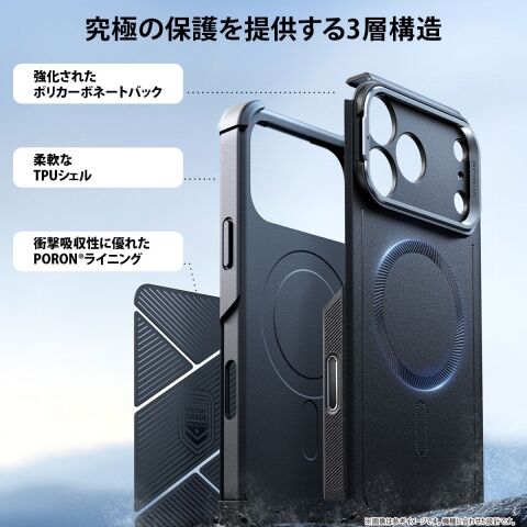 強化されたポリカーボネートバック、柔軟なTPUシェル、そして衝撃吸収性に優れたPORONライニングで構成された3層構造により、あらゆる衝撃からデバイスを強力に保護します。