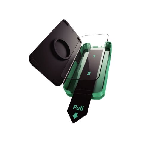 1.フィルム・引き出しタブの上に乗せるように、iPhoneを画面側からキットにはめ込んでください。