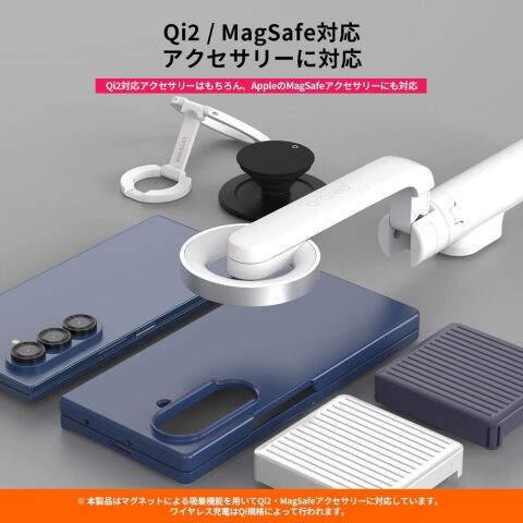 ※マグネット吸着により擬似的にQi2・MagSafe技術を利用する製品です。Qi1・MagSafe充電器と接続した際のワイヤレス充電は、Qiテクノロジーによって行われます。