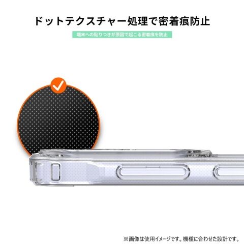 ケースの側面にドットテクスチャー処理を施し、端末への貼りつきが原因で起こる密着痕を防止します。