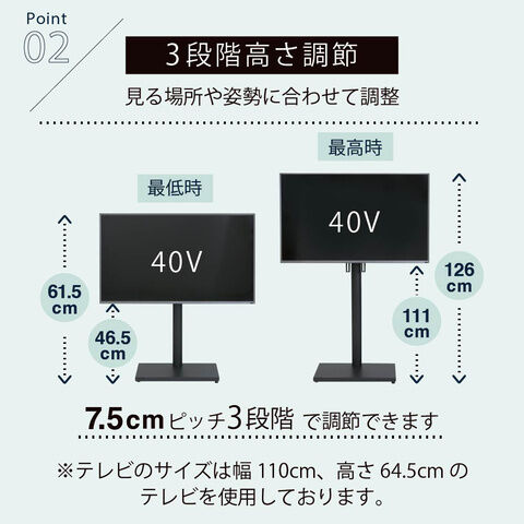 ◆50V型まで対応し、左右それぞれ30度まで首振り可能で、3段階の高さ調節機能付き。どこからでも快適な視聴が可能です。