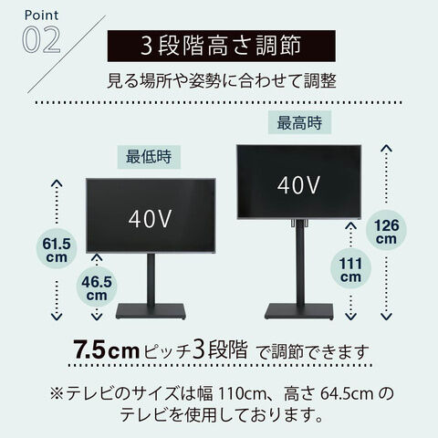 ◆50V型までのテレビに対応し、左右それぞれ30度まで首振り可能で、3段階の高さ調節機能付き。