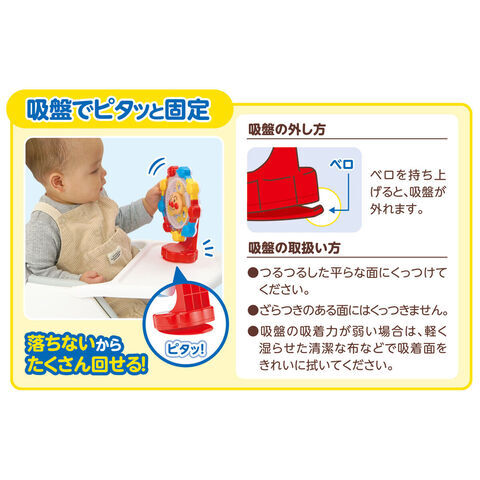 吸盤でピタッとくっつく仕様で、テーブルなどに固定して遊ぶことができるので赤ちゃんの一人遊びにぴったり!