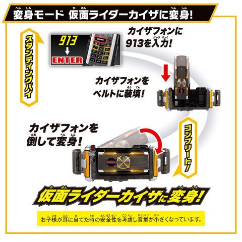 「913」「ENTER」を入力したカイザフォンをバックルにセット、「仮面ライダーカイザ」に変身!