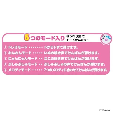 通常のピアノあそびはもちろん、モードを切替えることでぷしゅぷしゅや動物の声を楽しめたり、「はじまりぷしゅ」などの番組メロディや童謡メロディも流れて楽しく遊べます。