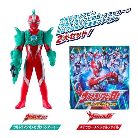 新番組に登場するウルトラマンオメガの新たな姿「ウルトラマンオメガ ガメドンアーマー」のソフビと購入キャンペーンで配布している「ウルトラソフビの日」ステッカーがコレクションできるファイルがセットになった商品です。