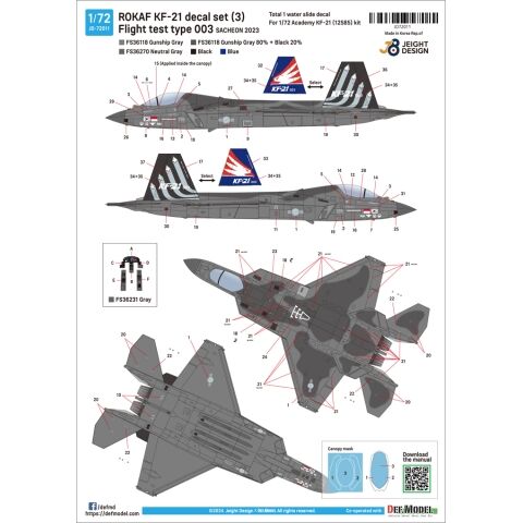 韓国が開発中の次世代ステルス汎用戦闘機KF-21ボラメ(ポラメ)の試作3号機「003」を再現できるデカールセットです。