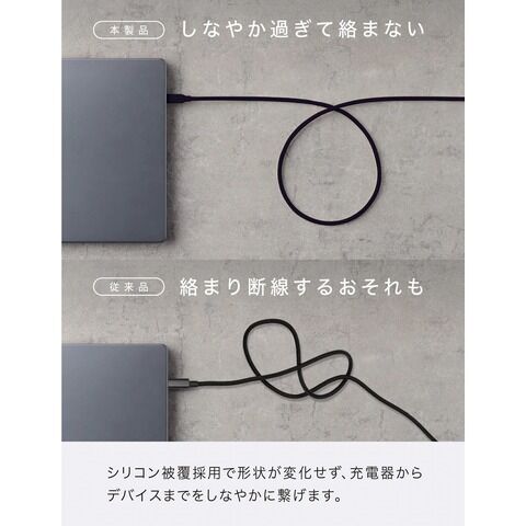 外装にシリコン素材を使用したことで、従来のケーブルにはない柔らかい質感を実現しました。優しい使い心地をご体感ください。カバンやポケットに入れても絡みにくく、出し入れもスムーズに行えます。折り癖や巻き癖が付きにくいため、いつでもストレスフリーにご使用いただけます。