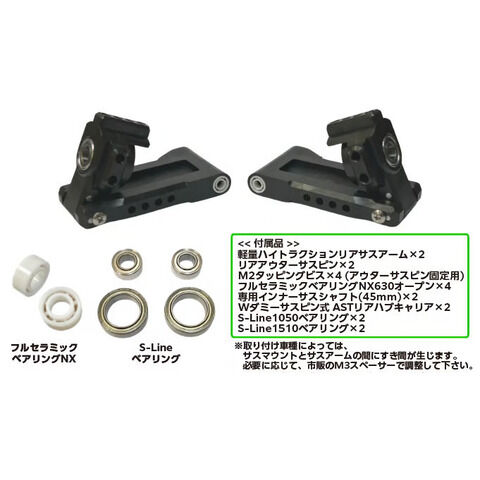 軽量ハイトラクションリアサスアーム×2 リアアウターサスピン×2 M2タッピングビス×4 (アウターサスピン固定用) フルセラミックベアリングNX630オープン×4 ハイトラクション ASTリアハブキャリア(TP-620/TP-621)×2 S-Line1050ベアリング×2 S-Line1510ベアリング×2
