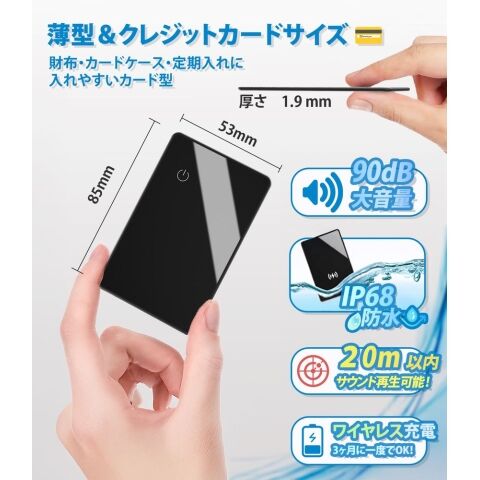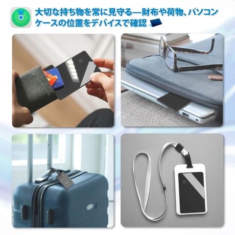 ◆厚さ1.9mmの超薄型で財布やカードケースにスマート収納◆スマホと離れると通知で置き忘れを防止◆Bluetooth圏内で大音量ブザーを鳴らして簡単に探せる◆ワイヤレス充電式で電池交換不要、繰り返し使えてエコ◆Apple「探す」ネットワーク対応で世界中で位置追跡◆Apple MFi認証取得で高いセキュリティと信頼性