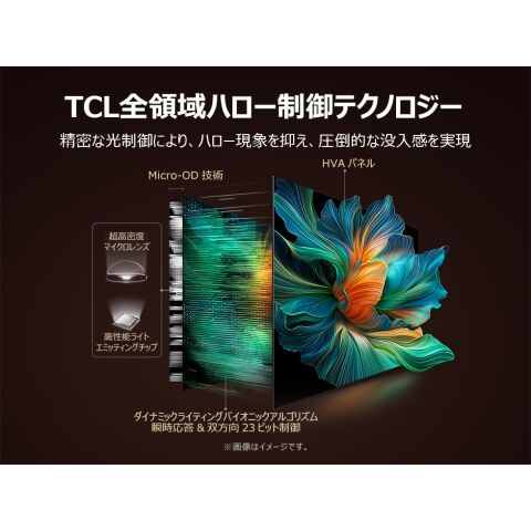 TCLの全域ハレーション制御技術は、高効率発光半導体とTCL社開発の光学技術を融合し、スーパーマイクロOD、光と影の制御アルゴリズム、TCL独自のTCL生産ハイエンドCSOT HVAパネル技術により、光の生成から結像までを全て賄っています。システムレベルで正確に光を制御することで、ハレーション現象を効果的に抑制し、プレミアムな視聴体験をお届けします。