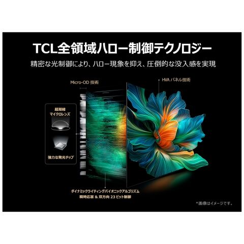 TCLの全域ハレーション制御技術は、高効率発光半導体とTCL社開発の光学技術を融合し、スーパーマイクロOD、光と影の制御アルゴリズム、TCL独自のTCL生産ハイエンドCSOT HVAパネル技術により、光の生成から結像までを全て賄っています。システムレベルで正確に光を制御することで、ハレーション現象を効果的に抑制し、プレミアムな視聴体験をお届けします。
