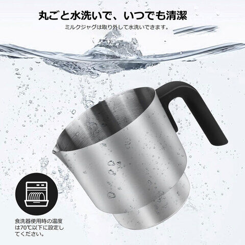 ミルクジャグは取り外して水洗いできます。(食洗機使用時の温度は70℃以下に設定してください。)