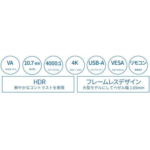 65インチのVAパネルを搭載し、4K(3840x2160)解像度に対応したHDR対応の大型液晶モニターとなります。4KはフルHD(1920×1080)解像度の約4倍の作業領域を実現する3840×2160ドットの解像度となり、高精細な表示を実現できます。大画面液晶は大きな会議室での使用はもちろん、サイネージ用途や、映画などの鑑賞等様々な用途にお使いいただけます。