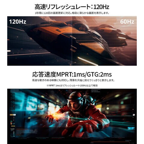 120Hzの高速リフレッシュレート、1ms(MPRT)の高速応答速度により、より滑らかな映像表示を可能にし、ゲームプレイに最適です。