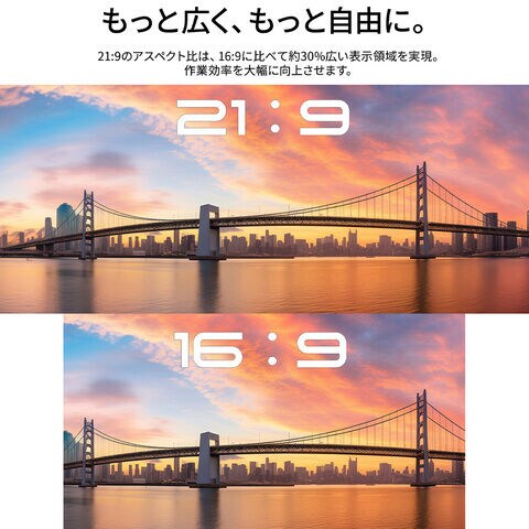 21:9のアスペクト比は、広い画面で複数の資料やウィンドウを同時に表示でき、快適な作業環境をサポートします。