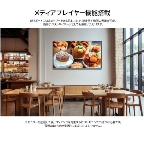 ※モニターを起動した後、コンテンツを再生するにはリモコンでの操作が必要です。電源 ON からの自動再生には対応しておりません。