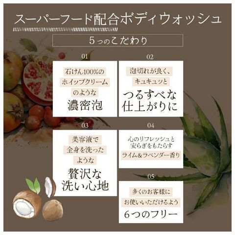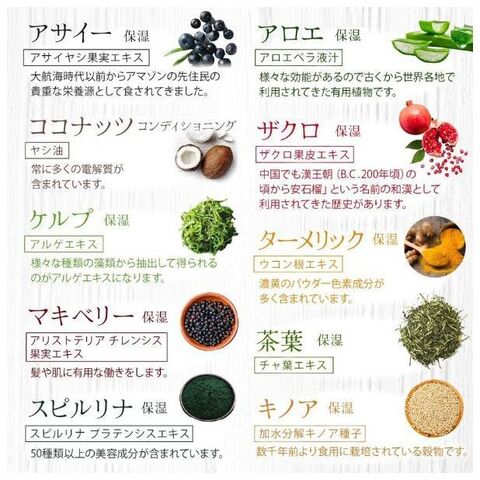 ■成分:水、ラウリン酸、ミリスチン酸、水酸化K、グリセリン、パルミチン酸、海塩、ココイルグルタミン酸2Na、ビオチン、リンゴ果実培養細胞エキス、アサイヤシ果実エキス、アルゲエキス、アロエベラ葉エキス、バオバブ種子油、サルビアヒスパニカ種子油、ヤシ油、アマニ油、ザクロ果実エキス、スピルリナプラテンシスエキス、ウコン根茎エキス、乳酸桿菌/ブドウ果汁発酵液、ブドウつるエキス、グリチルリチン酸2K、ラウリルベタイン、(カプリリル/カプリル)グルコシド、ラウリルグルコシド、トレハロース、アオモジ果実油、グレープフルーツ果皮油、ビターオレンジ葉/枝油、レモングラス葉油、レモン果皮油、香料、BG、ヒドロキシプロピルメチルセルロース、キサンタンガム、レシチン、メトキシメチルブタノール、クエン酸、EDTA-2Na、フェノキシエタノール