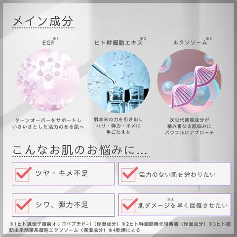 水、グリセリン、BG、グリセレス-26、1,2-ヘキサンジオール、ヒト幹細胞順化培養液、ヒト脂肪由来間葉系細胞エクソソーム、ヒト遺伝子組換オリゴペプチド-1、加水分解コラーゲン、ヒアルロン酸Na、ツボクサエキス、パンテノール、フナバラソウエキス、アスコルビルメチルカルボニルペンタペプチド-72-トリ-t-ブチルトリプトファナミド、酢酸トコフェロール、ラベンダーエキス、ローズマリーエキス、ハナハッカ花/葉/茎エキス、タチジャコウソウエキス、カルボマー、トロメタミン、プロパンジオール、ラウリン酸ポリグリセリル-10、エチルヘキシルグリセリン、キサンタンガム、香料、ベタイン、トリ(カプリル酸/カプリン酸)グリセリル、水添レシチン、ポリソルベート80、カプリリルグリコール