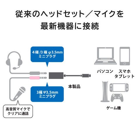 従来から使用しているφ3.5mmステレオミニジャックのヘッドセット、マイクを最新機器に接続できます。マイクを別途接続すれば、ヘッドセット使用中でも接続したマイクから通話することもできます。