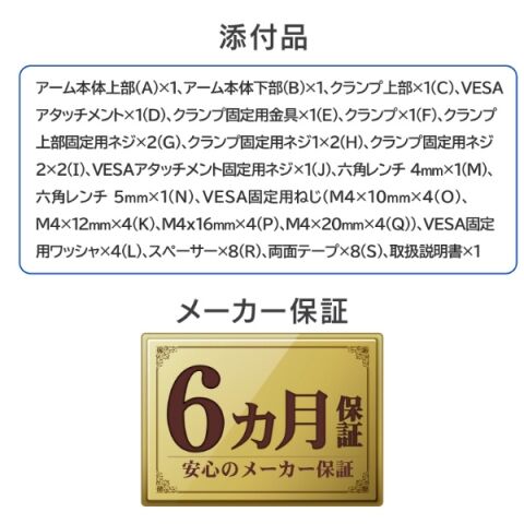 アーム本体上部(A) ×1、アーム本体下部(B) ×1、クランプ上部 ×1(C)、VESAアタッチメント×1(D)、クランプ固定用金具 ×1(E)、クランプ×1(F)、クランプ上部固定用ネジ×2 (G)、クランプ固定用ネジ1 ×2(H)、クランプ固定用ネジ2×2(I) 、VESAアタッチメント固定用ネジ ×1(J)、六角レンチ 4mm ×1(M) 、六角レンチ 5mm×1(N) 、VESA固定用ねじ(M4×10mm ×4(O)、M4×12mm ×4(K)、M4×16mm ×4(P)、M4×20mm×4(Q))、VESA固定用ワッシャ ×4(L)、スペーサー ×8(R)、両面テープ ×8(S)、取扱説明書×1
