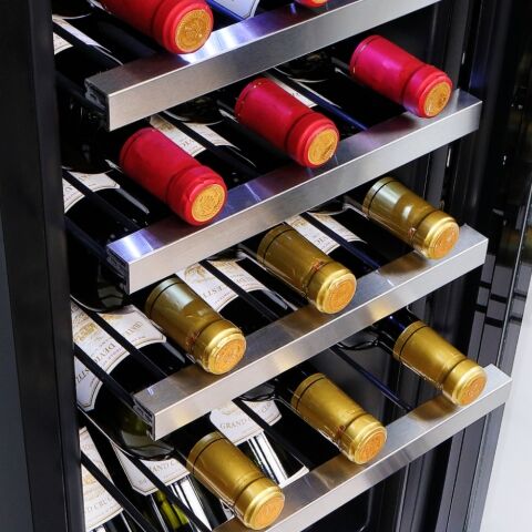 棚ピッチが90mmあり、ほとんどのブルゴーニュの横置き収納が可能。( 750mlボルドーで換算 )